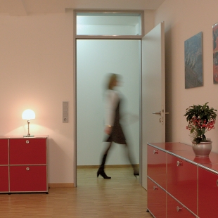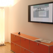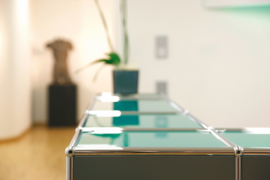 Das modulare System USM Haller zieht sich wie ein roter Faden durch das Einrichtungskonzept. Der funktionale Klassiker überzeugt durch seine Zeitlosigkeit und liegt dank seiner Umbau- und Erweiterungsfähigkeit mehr denn je im Trend. Unterschiedliche Farben, teils mit farbigen Glasabdeckungen, geben jedem Bereich in der Kanzlei ein anderes Gesicht. In Kombination mit ergonomisch durchdachten und optisch ansprechenden Arbeitstischen und -stühlen entsteht eine angenehme Arbeitsatmosphäre, in der sich alle Mitarbeiter sehr wohl fühlen.