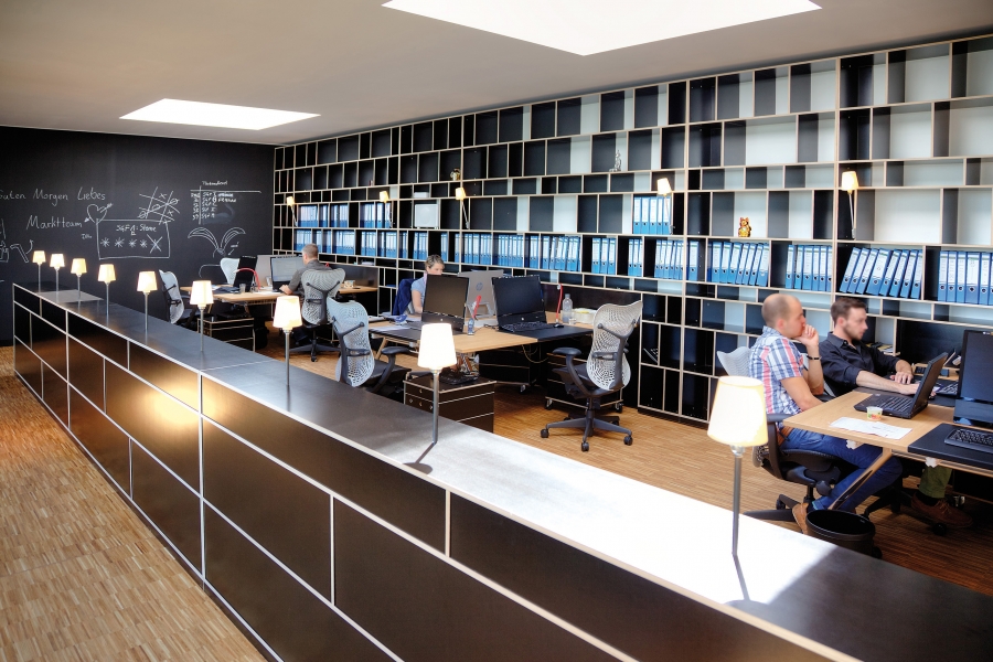 Im Arbeitsbereich konnten wir 14 Arbeitsplätze unterbringen. Die Mitarbeiter haben Blickkontakt und können sich austauschen. Umrahmt wird dieser Bereich von einem raumhohen Wandregal und einem halbhohen Raumteiler, der auf der dem Büro zugewanten Seite viel Stauraum beherbergt. Das durchgängige Beleuchtungskonzept bringt Licht ins Dunkel der Möblierung. Die riesige Wandtafel an der Stirnseite gibt jedem Teammitglied die Möglichkeit, sich kreativ zu verewigen.