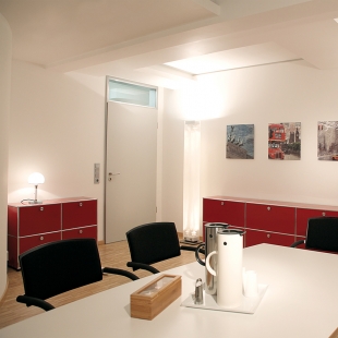 Das modulare System USM Haller zieht sich wie ein roter Faden durch das Einrichtungskonzept. Der funktionale Klassiker überzeugt durch seine Zeitlosigkeit und liegt dank seiner Umbau- und Erweiterungsfähigkeit mehr denn je im Trend. Unterschiedliche Farben, teils mit farbigen Glasabdeckungen, geben jedem Bereich in der Kanzlei ein anderes Gesicht. In Kombination mit ergonomisch durchdachten und optisch ansprechenden Arbeitstischen und -stühlen entsteht eine angenehme Arbeitsatmosphäre, in der sich alle Mitarbeiter sehr wohl fühlen.